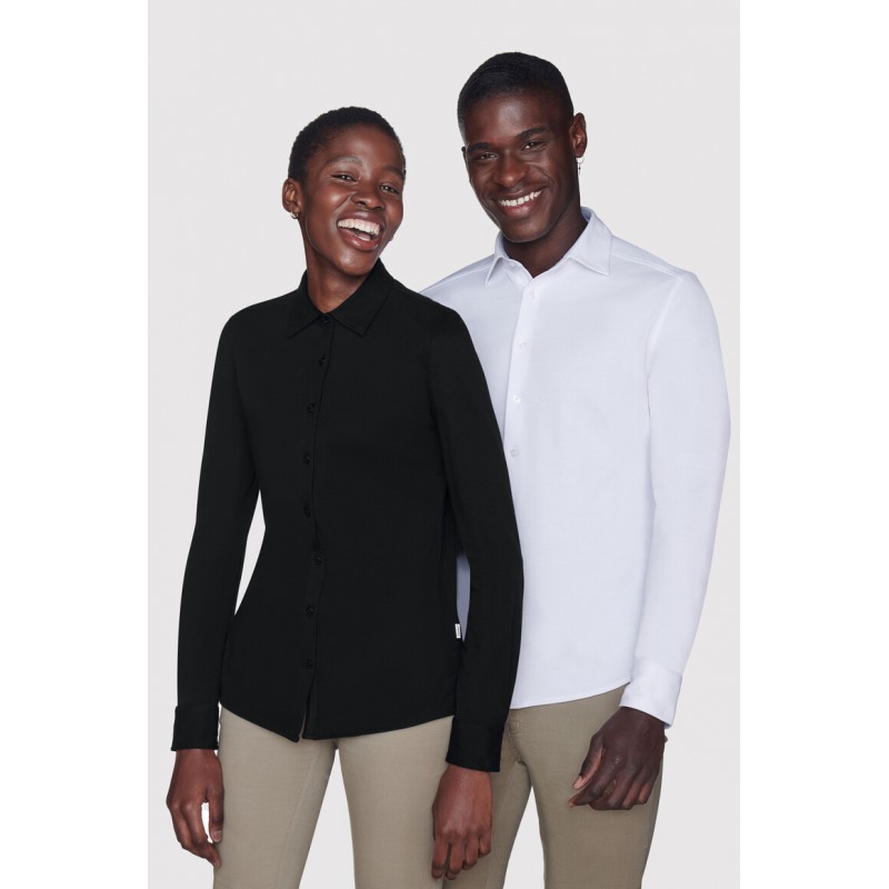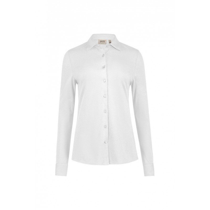 Functionele blouse met lange mouwen in fijne single jersey look met hoogwaardige bewerkte, modieuze knoopstrip met extra duurzaam genaaide, breukvaste 4-gaats knopen - kruislings genaaid en dubbelgeknoopt voor extra stevige grip - tone-in-tone met gelaserde HAKRO-belettering en extra reserveknop. Licht op maat gemaakt met pijlen achterin. De binnenkant van de ventilatieopeningen aan de zijkant en de knoopstrip zijn versterkt met ton-sur-ton textieltape. Gemaakt met behulp van een speciaal breiproces dat twee garens combineert om een HAKRO COTTON TEC-dubbelzijdig® materiaal te creëren. Het resultaat is een bijzonder fijn enkel jersey oppervlak gemaakt van lang, gekamd en ringgesponnen katoen aan de buitenkant en een gaaslaag gemaakt van de functionele vezel TRIACTIVE aan de binnenkant. Hierdoor wordt de blouse temperatuurregulerend, omdat vocht snel naar buiten wordt getransporteerd, waar het kan verdampen. Geweven HAKRO-halslabel gemaakt van hoogwaardig kettingsatijn met zachte, ultrasoon gesneden bandranden voor maximaal draagcomfort.