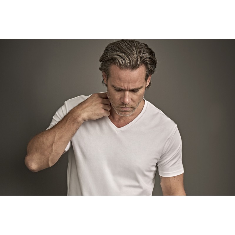 Getailleerd heren-T-shirt met stretch, V-hals, een smalle tweelaagse nekrib en versterkte schoudernaad.